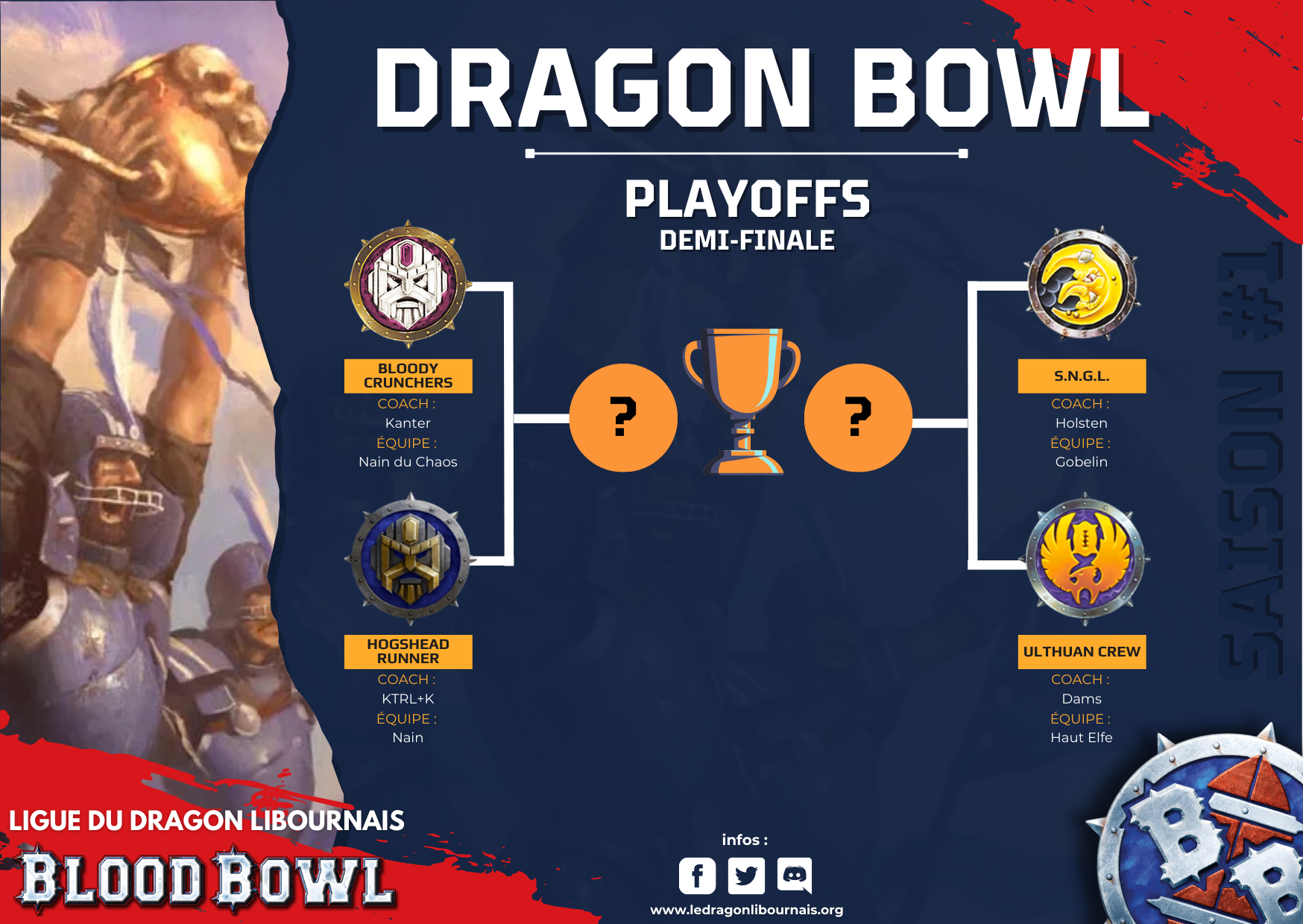 Nous y sommes enfin !!!! Les deux dernières journées de la Saison Régulière de la ligue de Blood Bowl du Dragon Libournais ont rendu leur jugement !!! Maintenant place aux Playoffs !!!!!!!!!!!!!!!!!!!!!!
