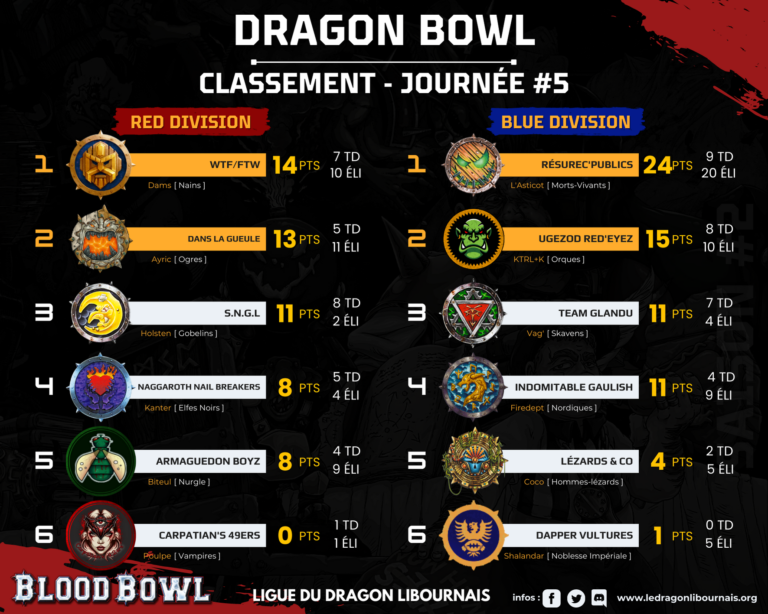 Avec un match au sommet qui a rendu son jugement en faveur des Résurec’Publics, tout est joué pour la 1ʳᵉ place dans la Blue Division. Les Ugezode Red’Eyez restent accrochés à leur seconde place, mais sont désormais a portée des poursuivants que sont les les Indomitable Gaulish et la Team Glandu. Ces deux équipes se rendent coup pour coup dans un interminable chassé-croisé au classement. Un de ces deux équipes finira-t-elle par décrocher ? Les Lezards & Co enregistre leur 1ʳᵉ victoire face au Dapper Vultures et passent devant eux au classement !